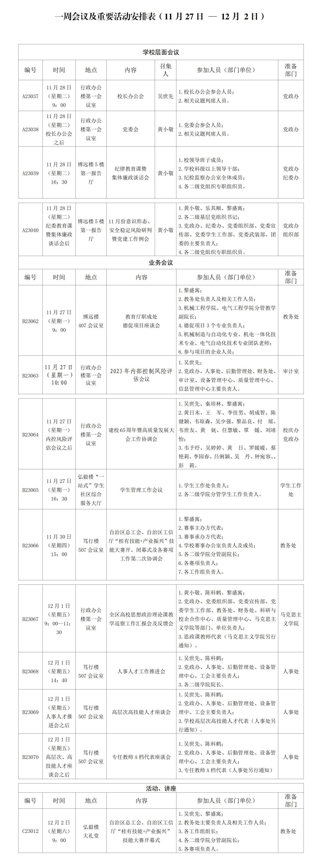 一周会议及重要活动安排表(11月27日 — 12月 2日)