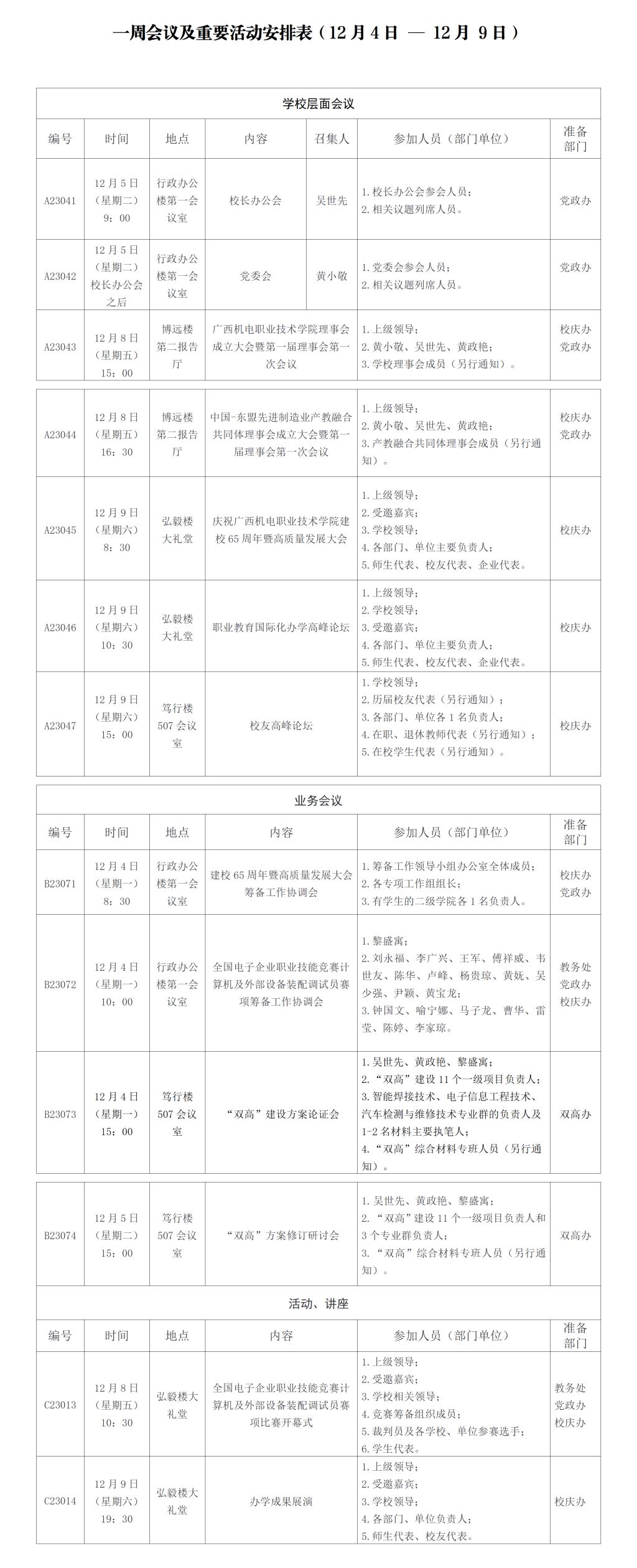 一周会议及重要活动安排表(12月4日 — 12月 9日)