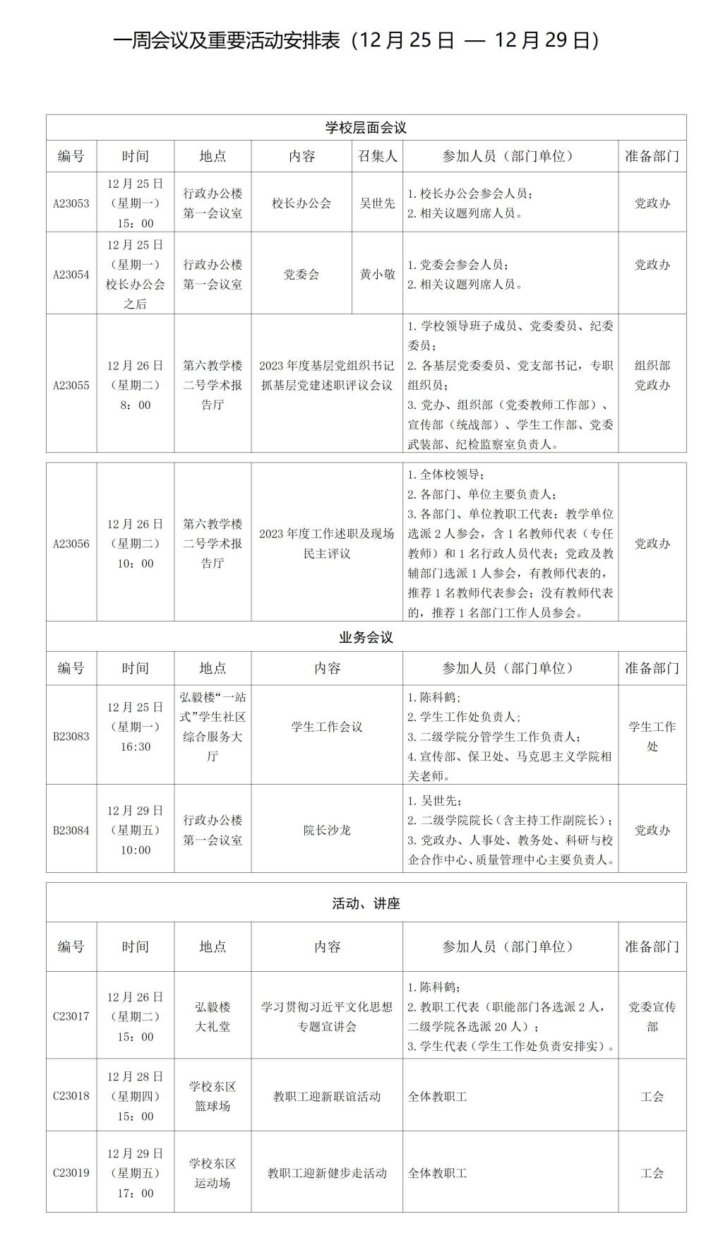 一周会议及重要活动安排表(12月25日-12月29日)