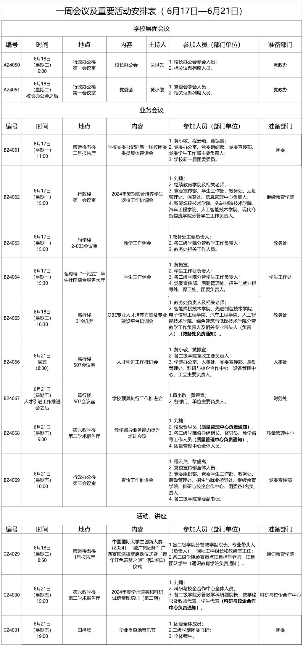 一周会议及重要活动安排表( 6月17日—6月21日)