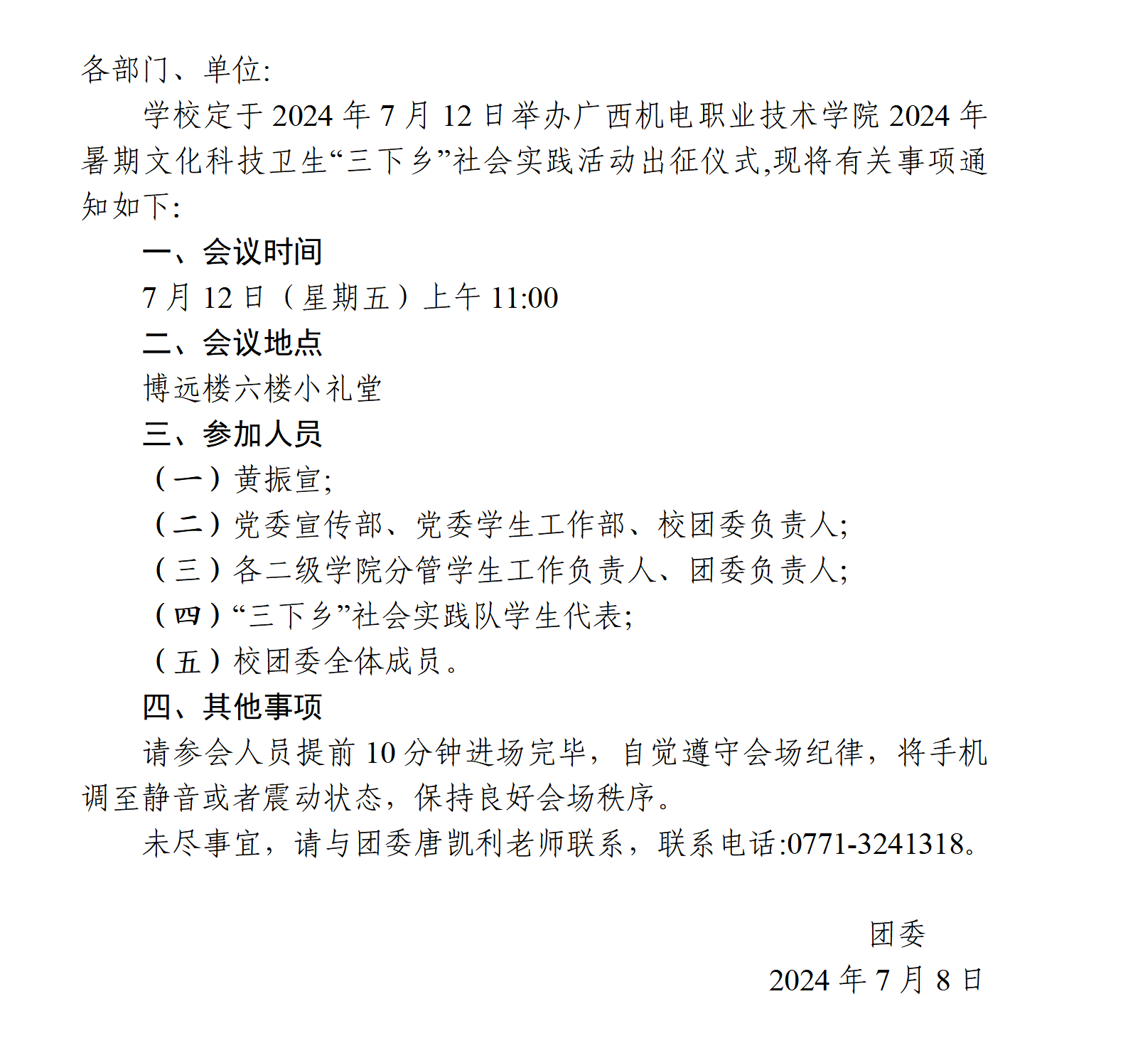关于举办awc77万象城官网2024年暑期文化科技卫生“三下乡”社会实践活动出征仪式的通知