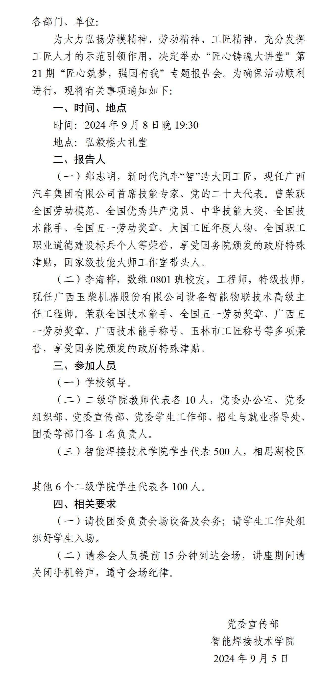 关于举办“匠心铸魂大讲堂”第21期“匠心筑梦,强国有我”专题报告会的通知