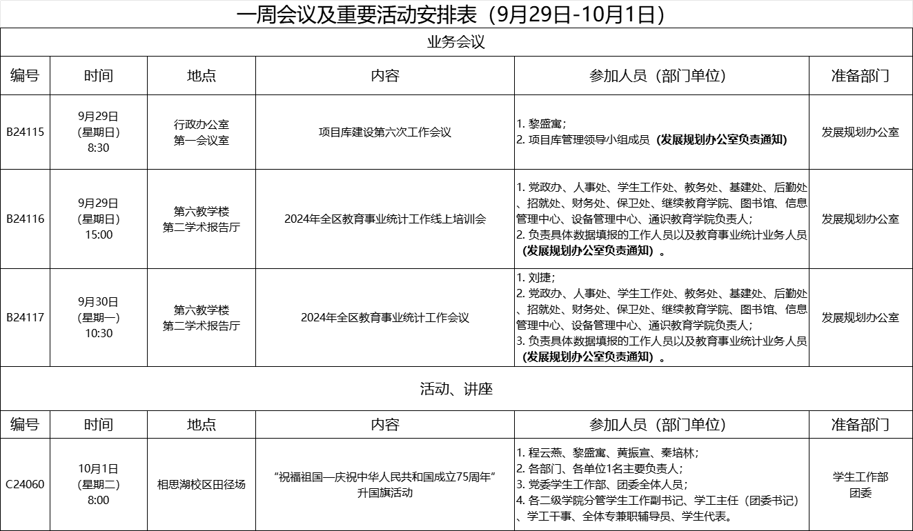 一周会议及重要活动安排表(9月29日-10月1日)