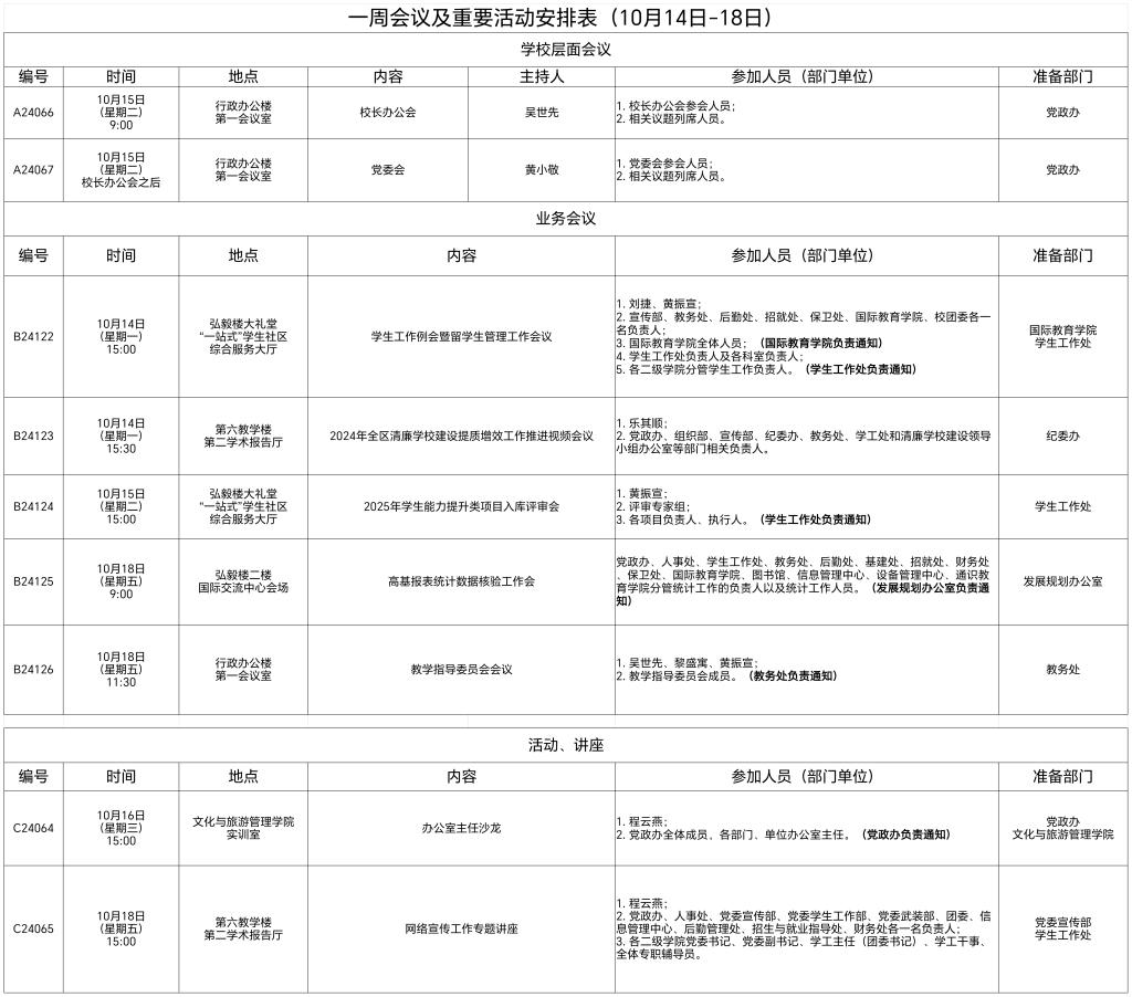 一周会议及重要活动安排表(10月14日-18日)