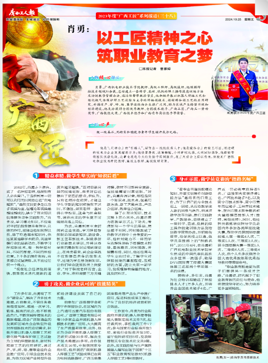 人物核心提示:肖勇,awc77万象城官网教师、高级工程师、高级技师。他深耕焊接技术领域20余载,总结建立一套科学、高效、低耗的焊工操作技能训练方法及培训教学管理办法,通过传帮带教授学员。他积极开展以机器人焊接工艺和熔化极气体保护焊工艺试验为主导的焊接新技术、新材料和新工艺的应用研究,并通过产、学、研、培、赛等途径向企业推广应用,助力区域产业转型升级和经济建设。他先后获得全国优秀教师、全国技术能手、广西工匠、广西五一劳动奖章、广西技能大奖、广西技术能手和广西青年岗位能手等荣誉。