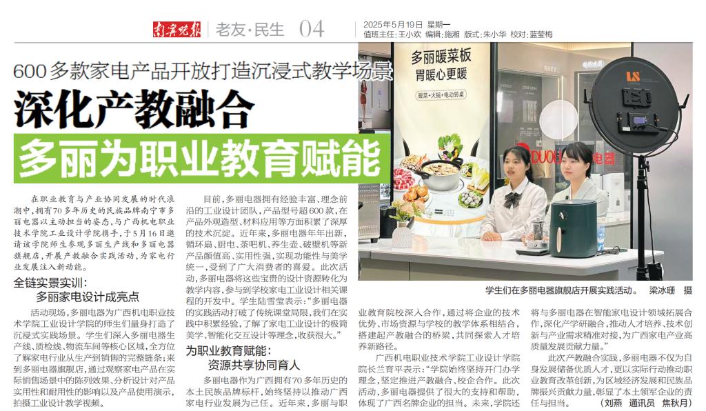 编者按:万象城官网深化产教融合创新实践,与民族品牌标杆南宁市多丽电器携手打造“校—企—产”协同育人新模式,为区域产业升级注入新动能。5月19日,《南宁晚报》以专题报道形式聚焦万象城官网与多丽电器共建的“沉浸式+全链条”校企合作项目。文章指出:通过组织师生深度参与企业现代化生产基地、终端卖场等全产业链实景教学,不仅让工业设计与市场需求实现“零距离”碰撞,更构建起“课程共建、技术共研、人才共育”的校企共生生态,培育出一批兼具创新思维与实践能力的复合型技术技能人才。这一模式生动诠释了职业教育服务产业发展的使命担当,为广西智能制造领域产教融合提供了可推广的实践经验。