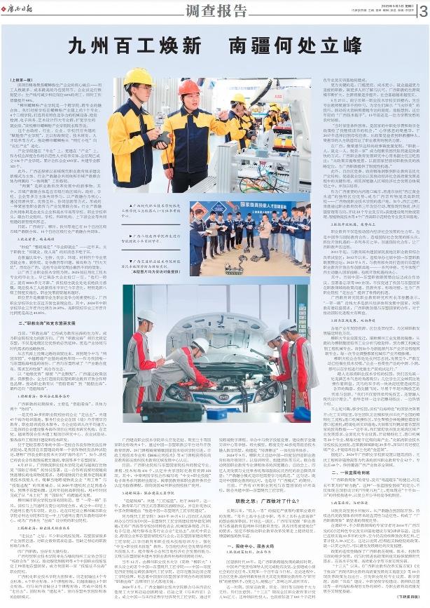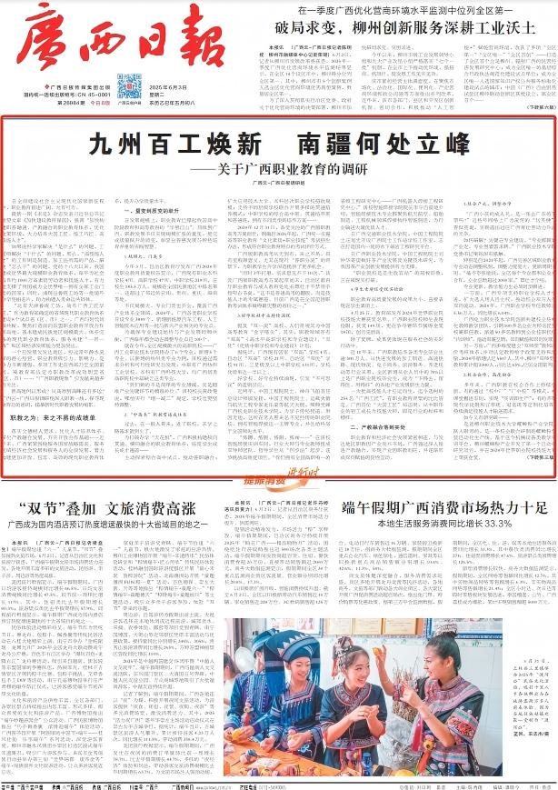 编者按:《广西日报》今天在头版刊发深度调研报道 《九州百工焕新 南疆何处立峰——关于广西职业教育的调研》,聚焦广西职业教育改革发展成效,系统梳理广西职教从“规模扩张”到“内涵提质”的跨越路径,文中提及万象城官网在专业建设、技术创新突破、工匠精神传承、国际合作标准输出与标准输出等方面的创新实践,彰显“机电力量”在南疆职教版图中的标杆作用。现将文章进行转载分享。