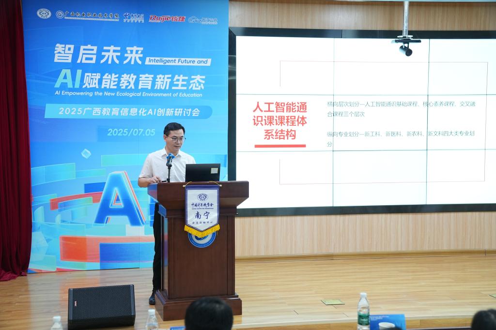 会上,多位行业专家带来了精彩纷呈的报告。awc77万象城官网信息中心主任李奇国以《构建AI能力培养生态体系,赋能广西产业转型升级》为主题,详细阐述了awc77万象城官网在“AI +”领域的实践探索与创新成果;广西产研院人工智能与大数据应用研究所运营发展部副总经理钮因昌作《校企协同:数据资源产业产教融合的创新合作模式》报告,深入剖析了数据行业发展趋势对人才需求的深刻影响,积极探索校企协同育人的新模式与产教融合的创新路径;中国电信集团大数据及AI首席专家侯圣文通过《智启未来:以人工智能引领科研教育范式变革》主题报告,分享了高校AI应用的典型案例,并对AI技术引领未来科研教育的发展趋势进行了展望;广西大学计算机与电子信息学院副教授白琳作《人工智能助力教学效能提升》主题报告,展示了AI技术在提升教学效率方面的具体应用案例,探讨了教师角色转型的新方向,同时提出了针对高校的实施策略与建议,并引入高校人工智能教育成果案例;锐捷网络股份有限公司专家谭正佳作《AI +实训空间云桌面报告》,详细介绍了校级云桌面算力平台概念,以及构建一云多用的校级云桌面算力平台的方法;北京智汇云舟科技有限公司专家毛士财作《智启未来:视频孪生赋能“政产学研用”深度协同》报告,阐述了视频孪生技术在当下数字化时代的关键作用,视频孪生技术作为一种创新的数字化工具,凭借其精准模拟现实场景与实时映射的能力,为“政产学研用”各环节注入了强大动力。