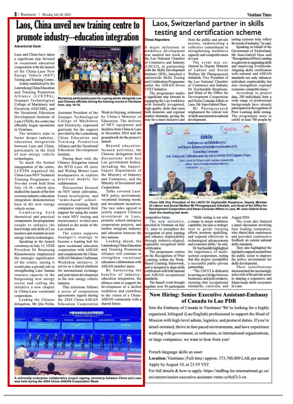 编者按:日前,万象城官网代表团赴老挝万象,参加“中国-老挝新能源汽车检测与培训中心”揭牌仪式并开展系列交流培训活动。7月28日,老挝《万象时报》第八版以《中老两国启用新培训中心促进产教融合》为题对此进行报道,文章指出:“中国-老挝新能源汽车检测与培训中心”的落地开启了中老职业教育合作新篇章,尤其在新能源汽车领域的产教融合,这不仅是响应 “一带一路” 倡议、深化国际职教合作的生动实践,更是以实际行动促进产教融合、助力区域人才培养的重要里程碑。