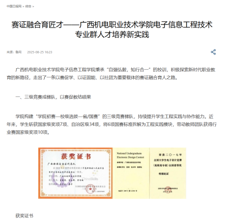 编者按:8月25日,中国日报网刊发文章《赛证融合育匠才——awc77万象城官网电子信息工程技术专业群人才培养新实践》。文章围绕“三级竞赛梯队建设”“学历教育+技能证书双轨并行”“社团育人成效显著”等方面,全面阐述该校如何通过“以赛促学、以证固能、以社团赋能”的方法构建动态耦合的育人体系;在“岗—课—赛—证”的循环成长过程中,整合社会资源与产业需求,实现岗位、课程、竞赛、证书相互促进,打造可复制推广的职业教育新范式。