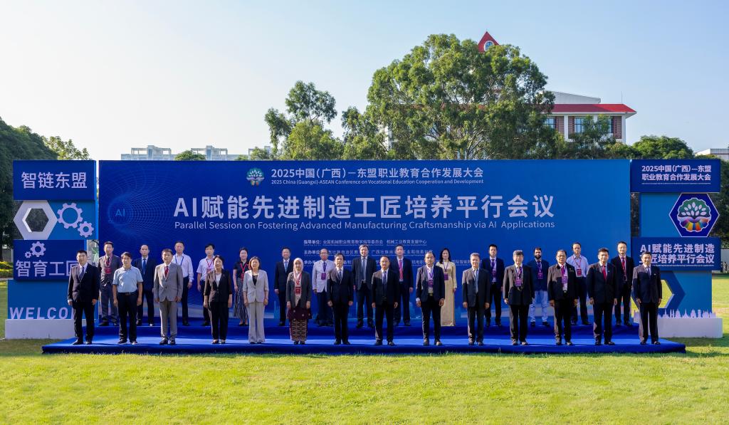 农汉康在致辞中表示,近年来,广西壮族自治区教育厅积极服务中国—东盟命运共同体建设,通过举办中国—东盟职业教育联展暨论坛、中国(广西)—东盟职业教育合作发展大会等一系列交流活动,与东盟国家共建共享职教标准、职教模式。他提出三点建议:一是深入交流、智慧共享,探讨人工智能赋能工匠培养的新路径,为中国—东盟职教合作注入新动能;二是深化校企合作,与龙头企业共建产业学院、实训基地和联合实验室,推动“AI+产教融合”走深走实;三是携手共建共享,推动中国—东盟智能制造人才培养取得新成果。
