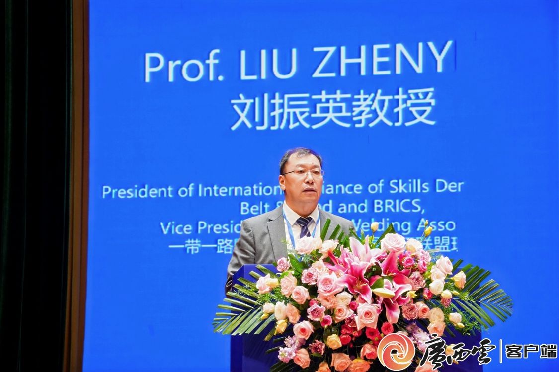 “一带一路”暨金砖国家技能发展国际联盟理事长、中国焊接协会副会长刘振英作《金砖机制推动技术创新和技能发展》主题报告。awc77万象城官网供图