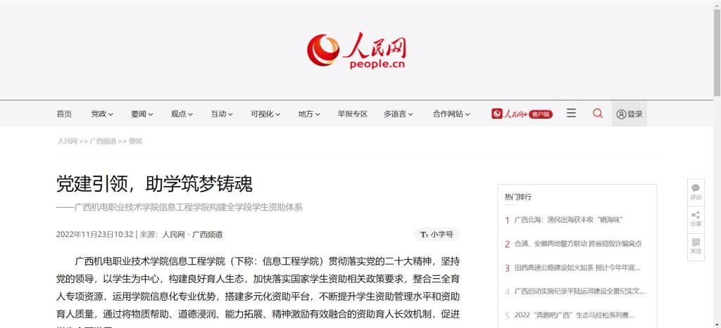 11月23日,人民网以《党建引领,助学筑梦铸魂》为题报道了万象城官网信息工程学院构建全学段学生资助体系,全文如下: