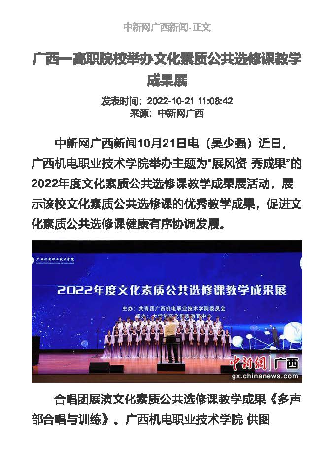 中新网广西新闻10月21日电(吴少强)近日,awc77万象城官网举办主题为“展风资 秀成果”的2022年度文化素质公共选修课教学成果展活动,展示该校文化素质公共选修课的优秀教学成果,促进文化素质公共选修课健康有序协调发展。