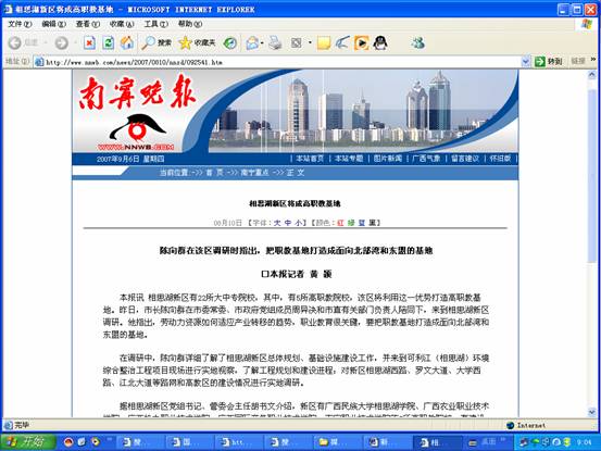陈向群指出,劳动力资源如何适应产业转移的趋势,职业教育很关键,要把职教基地打造成面向北部湾和东盟的基地。他强调,相思湖新区的功能分区中,要把高教园建设作为重点,依托新区大中院校、科研院所集中的特点,打造成南宁市有规模、有特色的教育基地、科教中心,特别是规划建设职业教育和劳动力培训、实践基地,根据南宁产业发展和产业选择方向,引进一批高职、中职院校,以此大力推动职业教育工作,为南宁市进一步做好承接东部地区和国际产业转移做好劳动力资源上的准备。