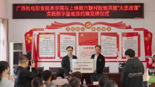 活动中,上林县巷贤镇党委副书记罗程丹对该校积极推进校地“大思政课”共建表示了充分肯定和热烈欢迎,期待双方在找准贯彻落实党的二十大精神的切入点、结合点、着力点上以实干实绩推动党的二十大精神落地生根,在社会实践、现场教学、人才培育等方面开展广泛深入的合作。双方签订了“大思政课”基地共建活动,并举行了“美丽中国”专题教育“大思政课”实践教学基地牌匾交接仪式,同时开展了一堂行走在“绿水青山”间的现场教学和讲授了一堂宣传推动党的二十大精神走深走实的党课。