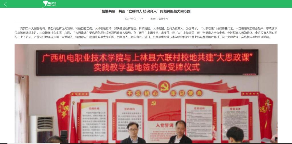 2023年4月1日,中国青年网以《校地共建:共画“立德树人 铸魂育人”同频共振最大同心圆》为题报道了万象城官网师生赴上林县巷贤镇六联村开展“大思政课”实践教学基地共建活动。全文如下: