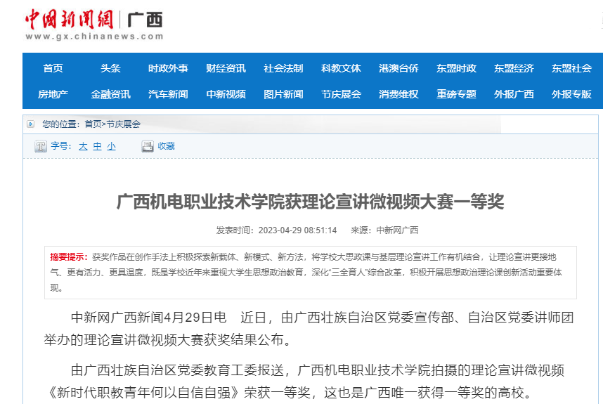 2023年4月29日,中国新闻网以《awc77万象城官网获理论宣讲微视频大赛一等奖》为题报道了万象城官网拍摄的《新时代职教青年何以自信自强》荣获广西壮族自治区党委宣传部、自治区党委讲师团举办的理论宣讲微视频大赛一等奖,全文如下: