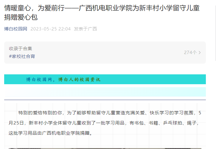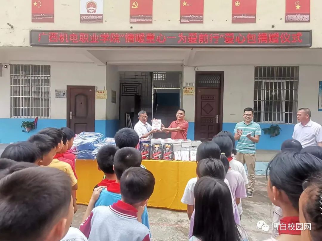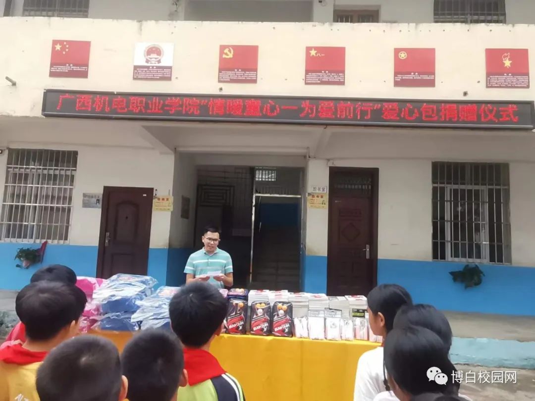 深入学习贯彻党的二十大精神,积极推进第二个百年奋斗目标的实现,助力推进乡村振兴战略实施,加强未成年人的关爱和保护工作,改善未成年人的学习生活环境,促进未成年人的健康快乐成长努力让更多孩子享有高质量更加公平的教育,拥有更多的阅读机会,丰富精神世界,点亮理想。万象城官网对帮扶村开展了“情暖童心,为爱前行”爱心学习包公益捐赠活动。5月25日,博白校园网以《情暖童心,为爱前行——广西机电职业学院为新丰村小学留守儿童捐赠爱心包》为题,报道了万象城官网的“情暖童心,为爱前行”爱心学习包公益捐赠仪式。全文如下: