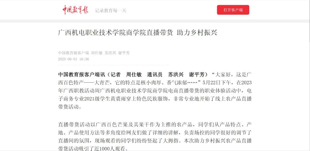 2023年6月1日,中国教育报客户端、中国教育新闻网以《awc77万象城官网商学院直播带货 助力乡村振兴》为题,报道了万象城官网职教活动周中,商学院电商直播带货助力乡村振兴的职业体验活动。全文如下: