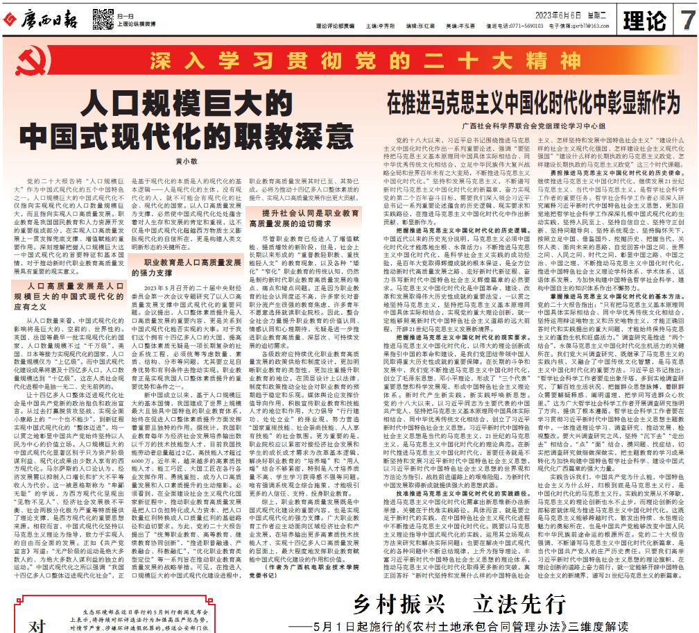 6月6日,广西日报理论版刊发万象城官网党委书记黄小敬理论文章《人口规模巨大的中国式现代化的职教深意》。文章从人口高质量发展是人口规模巨大的中国式现代化的应有之义、职业教育是人口高质量发展的强力支撑、提升社会认同是职业教育高质量发展的迫切需求三个维度论述中国式现代化与职业教育高质量发展的深刻联系。