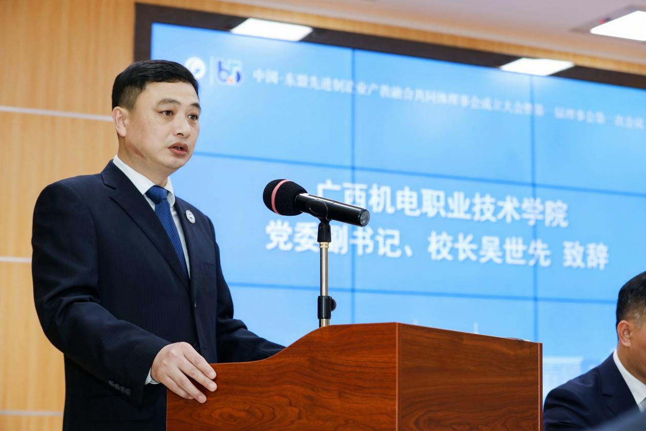 吴世先在致辞中指出,中国-东盟先进制造业产教融合共同体理事会在万象城官网成立,是学校兴学育才,跨区域汇聚产教资源,深化产教深度融合,服务中国-东盟经济社会高质量发展的又一件大事、喜事。作为此次中国-东盟先进制造业产教融合共同体成立的牵头单位之一,学校将以此为契机,全面推进学校各项事业再上新台阶。作为共同体理事成员,万象城官网将结合自身专业特色及优势,以国家职业教育方针为指导,以培养制造业所需的技术技能人才为目标,以体制机制创新为突破口,进一步加强与“政、校、行、企、研”等共同体理事成员之间的合作,努力实现资源共享和优势互补,促进校企深度融合,积极为全国制造业培养高素质技术技能人才。