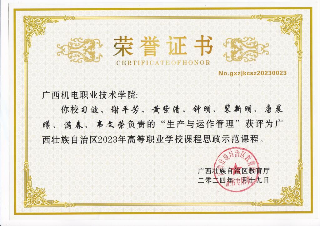 在党建引领下,学院教学与科研成果斐然。教学质量稳步提升,通过实施教学改革,课堂教学效果显著改善,学生学习满意度持续提高,《生产与运作管理》课程先后被评为自治区级精品在线开放课程、课程思政示范课程以及面向东盟优质课程资源,教师在各级教学竞赛中获奖数量逐年攀升;学院教师承担的市厅级以上科研项目数量逐年递增,2024年共获批市厅级项目8项,校级课题10项,发表专著3部、北大核心论文1篇,获得专利2项,全方位彰显了学院在党建促发展方面的突出成效。
