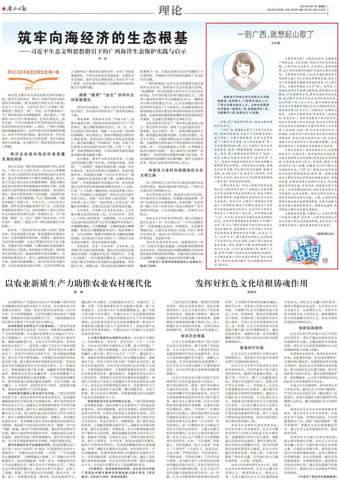 “一到广西,就想起山歌了。”习近平总书记的一席话言近旨远,引起了人们的强烈共鸣。曾几何时,“山歌不唱忧愁多,大路不走草成窝”“一根竹子不成排,众人合伙把船开”等一句句富有特色的山歌,让人们看到广西不仅有秀美风景,更有一群勤劳智慧、积极向上的人民。然而,有人却将传统简单等同于“过时”,认为山歌已与现代生活脱节,甚至觉得“土气”。这些认识偏差的根源在于浅表性理解山歌的厚重文化价值。打破这些认识偏差,需要我们自信自强,对山歌文化进行阐释、传播与创新,让山歌走出广西,被更多人看得见、记得住并心生向往,为社会主义文化强国建设增添一份专属广西的色彩和韵味。