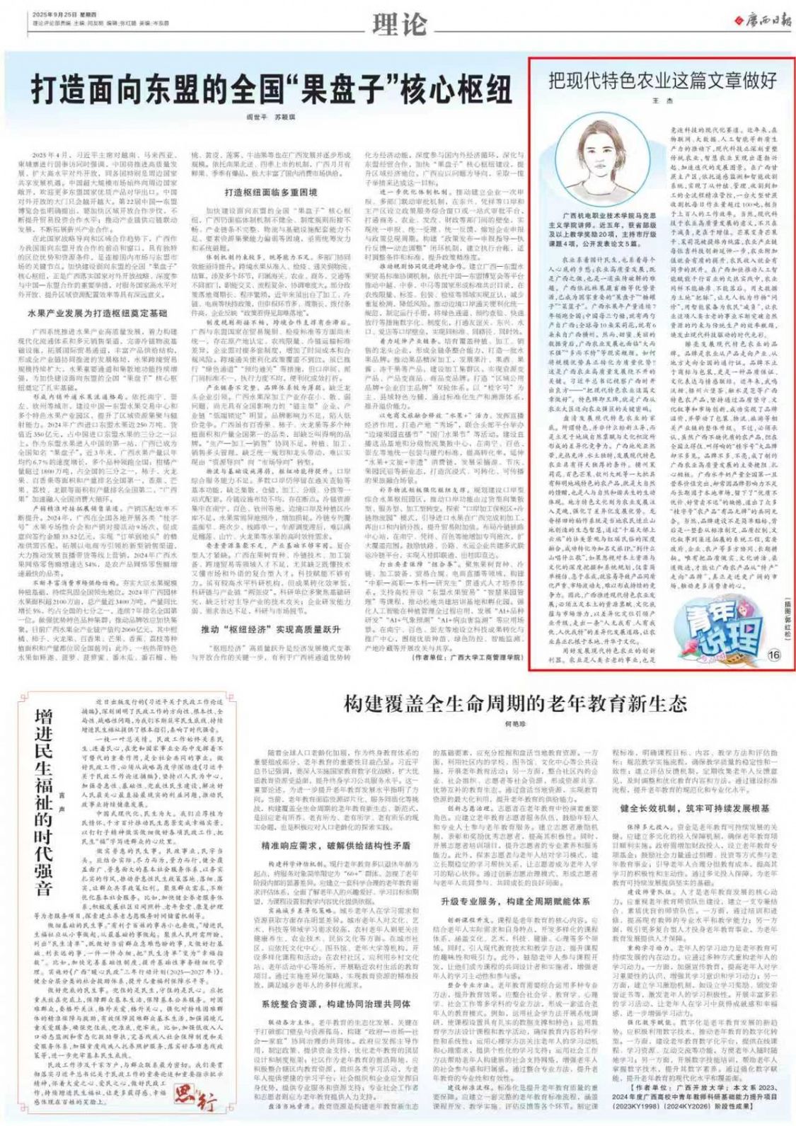 擦亮发展现代特色农业的品牌。品牌是农业从产品走向产业、从地方走向全国的通行证。品牌不止于商标与包装,更是一种品质保证、文化表达与情感联结。近年来,武鸣沃柑、梧州六堡茶、融水灵芝等广西特色农产品,坚持通过品质坚守、文化叙事和市场创新,成功实现了品牌溢价,并带动了包装、物流、旅游等相关产业链的整体升级。不过,必须承认,虽然广西不缺优质的农产品,但在全国立得住、叫得响的“桂字号”大品牌却不多见。品牌不多、不亮,成了制约广西农业高质量发展的主要梗阻、扎心短板。广西水牛奶产量全国第一且营养价值突出,却常因品牌影响力不足而长期困于本地市场,留下了“优质不优价、好货卖不远”的缺憾,道出了众多“桂字号”农产品“有品无牌”的共同无奈。当然,品牌建设不是简单贴标,背后是一整套从标准制定、品质控制、文化叙事到渠道拓展的系统工程,需要政府、企业、农户等多方协同、长期耕耘。唯有把品质做实、文化讲活、渠道做通,才能让广西农产品从“特产”走向“品牌”,真正走进更广阔的市场、触动更多消费者的心。