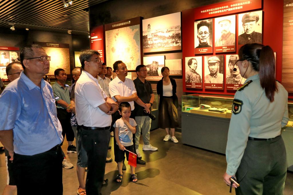 在大型群雕前,全体党员肃立,向红军烈士敬献鲜花,重温入党誓词,缅怀革命先烈。随后,全体人员在讲解员的带领下参观了红军长征突破湘江纪念馆。在纪念馆一层,首先映入眼帘的是“突破湘江”主题雕塑,该雕塑由“突破、渡江、后卫”三个战斗的瞬间组成,突出展示了广大指战员在湘江战役中信仰坚定,顾全大局,勇于胜利,勇于突破,勇于牺牲的革命精神。紧接着又跟随讲解员学习了新圩阻击战、脚山铺阻击战、光华铺阻击战三大战役,感受到革命先辈们只能前进、绝不后退的决心。来到纪念馆二层,走上界首渡口中央军委纵队渡江的浮桥,了解到除此渡口之外还有三个渡口,分别是凤凰山渡口,大坪渡口,屏山渡口。除了三大阻击战场和四大渡口之外,讲解员又着重讲解了后卫阻击战场,后卫阻击战中红十三师和红三十四师作为殿后的部队几乎全军覆没。红三十四师师长陈树湘在掩护军委纵队渡过湘江之后,由于兵力不足无法渡江又返回湘南打游击战,在腹部中弹被俘的情况下,陈树湘毅然用手绞断肠子,英勇牺牲,实现了为中华苏维埃流尽最后一滴血的誓言。弹尽粮绝的韩伟跳崖,用生命诠释对党的忠诚。渡过湘江之后,为了绕出敌人的包围圈,红军又翻越老山界的最高峰——猫儿山。山路险陡,四处都是悬崖峭壁,红军用必胜的信念翻越了华南之巅实现了湘江战役的突破。