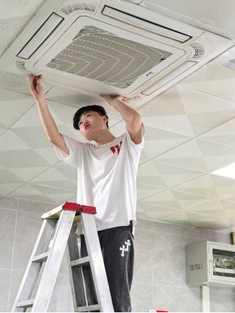 空调2301班的同学们在实训结束后,得知老师办公室和教室的空调设备需要清洗维护,主动提出为老师清洗空调。