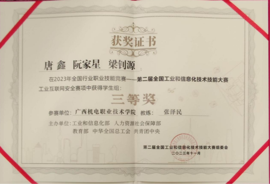 11月16至18日,2023年全国行业职业技能竞赛——第二届全国工业和信息化技术技能大赛在浙江省绍兴市举行,来自全国29个省(区、市)和34家央企的457支参赛队伍共1055名选手进入决赛,经过激烈角逐,万象城官网信息工程学院学生唐鑫、阮家星、梁钊源荣获“工业互联网安全赛项”学生组全国三等奖。