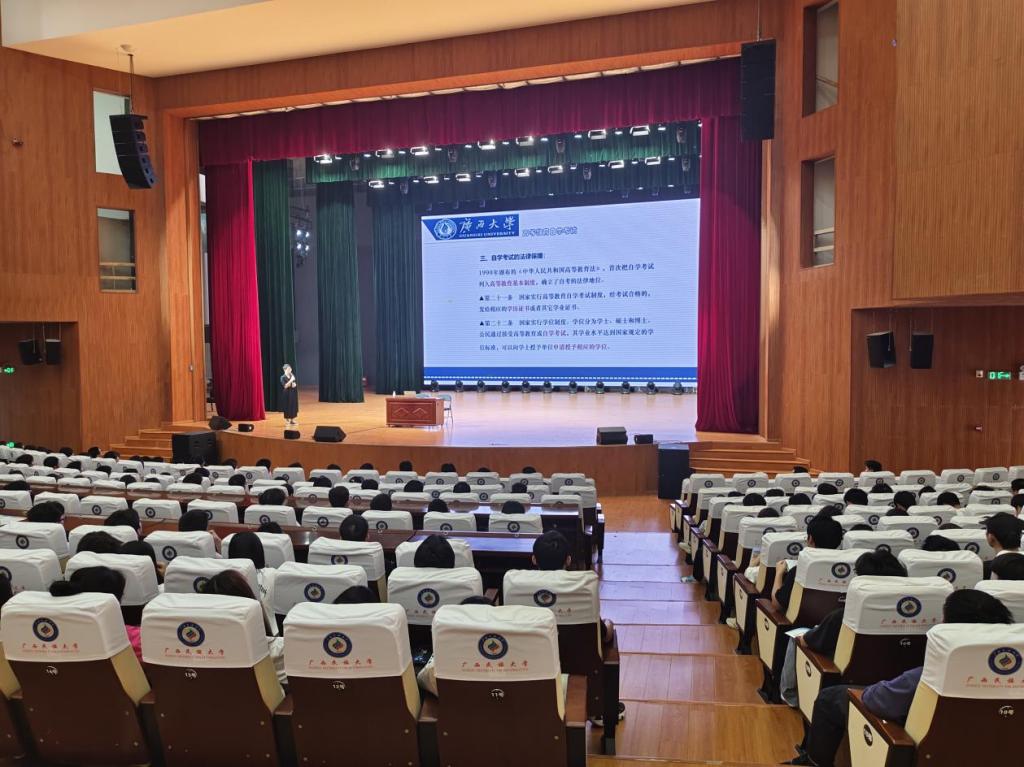 为进一步加强2023年下半年自学考试专本衔接、网络助学招生报名工作,提高学校双高建设继续教育和社会服务项目稳步推进,2023年10月24日下午,广西大学继续教育学院自考中心副主任廖兰英副教授在思源湖大学生活动中心召开信息工程学院专本衔接自学考试助学班招生宣讲会。学院自考助学班相关负责教师和2023级1000多名新生参加了此次招生宣讲会。