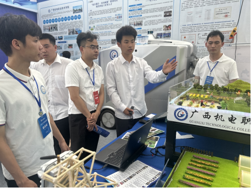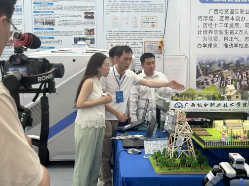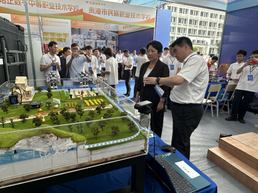 学校党委书记黄小敬向自治区工业和信息化厅二级巡视员陆爱平介绍参展作品