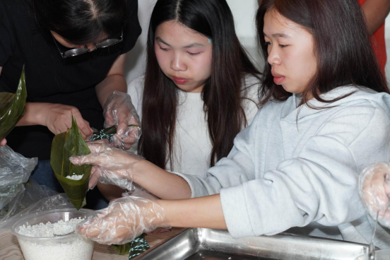 活动现场,粽叶与糯米的香气弥漫在空气中,中国学子与老挝留学生围坐在一起,共同体验包粽子的乐趣。对于老挝留学生来说,包粽子是一项全新的体验。在中国同学的耐心指导下,他们拿起粽叶,包裹糯米、填充馅料,一步步感受着中国传统节日的独特魅力。留学生欣妍兴奋地表示:“这是我第一次在中国过端午节还有包粽子,虽然一开始有些手忙脚乱,但是在中国朋友的帮助下逐渐掌握了技巧,粽子很好吃,这个活动也让我对中国文化有了更深入的了解。”