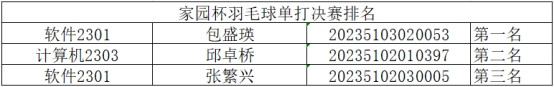 经过紧张激烈的角逐,最终软件2301班包盛瑛同学力压群雄,摘得本次“家园杯”羽毛球比赛冠军桂冠,计算机2303班邱卓桥同学荣获亚军,软件2301张繁兴获得季军,其余同学也以出色表现展现了拼搏精神,共同为赛事画下圆满句点。