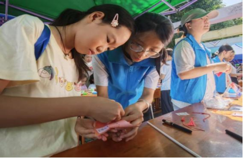 在活动现场,我院青年志愿服务者积极参与三大板块志愿服务。科技体育科展区成为焦点,无人机编队表演引得孩子们欢呼连连,AI机器人电子对抗赛等项目将爱国教育与科技实践深度融合。教务活动科展区“情绪释放站”通过趣味心理游戏疏导青少年压力,中秋灯谜区悬挂的50余条原创灯谜将传统文化与时代精神巧妙结合。书法美术科展区拓印“云墨木韵”木刻雕版,志愿者手把手教孩子们在宣纸上拓印出五星红旗图案,超轻黏土手工营里百余件"我爱祖国"主题作品渐次成型。