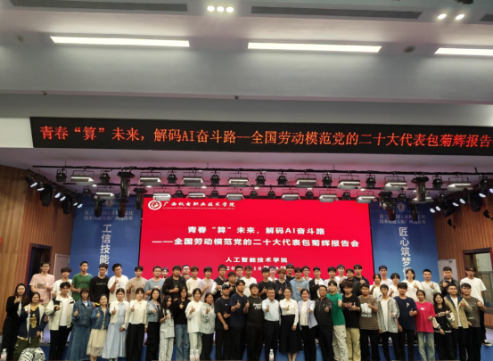 整场报告会在热烈的掌声中落下帷幕。人工智能技术学院负责人在总结时表示,包菊辉同志的分享既有个人奋斗的温度,又有产业发展的高度,更有对青年成长的期许,为师生们带来了深刻的启发。希望全体师生传承劳模精神,以“但行好事”的坚守扎实工作、认真学习,以“要问前程”的主动对接产业需求,在广西智能发展浪潮中做“结实的螺丝钉”,既当脚踏实地的奋斗者,又当仰望星空的追梦人,为学校高质量发展,为奋力谱写中国式现代化广西篇章作出更大贡献。