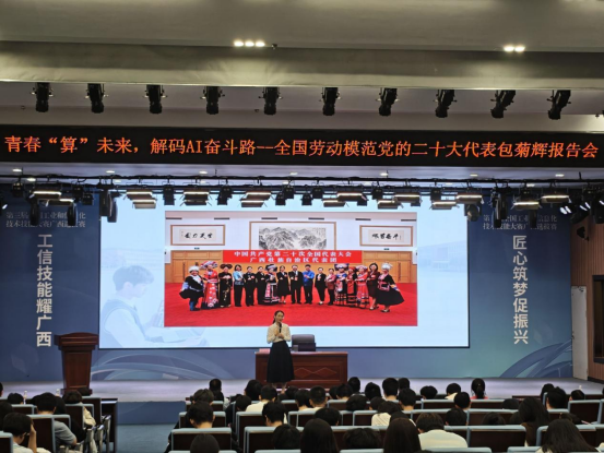 包菊辉现任北海高新区海洋产业联合党支部书记、广西正五海洋产业股份有限公司、北海佰佳人力资源有限公司、广西华控供应链有限公司人力行政总监、工会主席。她在民营企业从事基层工作20年,从一名普通职工成长为全国劳动模范、全国优秀工会工作者、全国巾帼标兵,当选党的二十大代表。报告会上,包菊辉以自身20余年基层奋斗经历为切入点,围绕“弘扬劳模精神,解码AI奋斗路”主题,从“但行好事”“AI时代关联密码”“要问前程”“以匠心赴未来”四个维度展开分享,为在场师生带来了一场兼具思想深度与实践价值的精神盛宴。