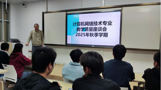 2025年11月25日下午,我院计算机网络技术专业2025年秋季学期期中教学质量座谈会在A-401多媒体教室召开。各班班长、学习委员代表全体同学参会。会议由伍德雁老师主持,多名专业团队教师参与。