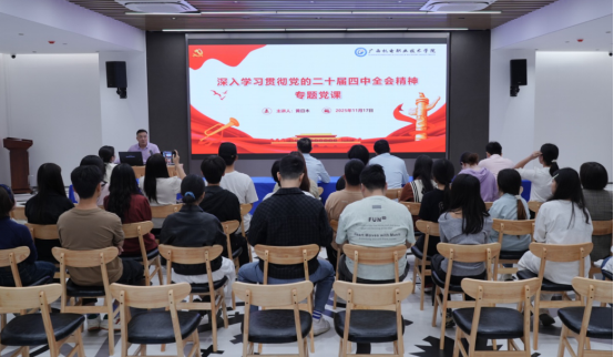随后,学院党委书记黄日木以“深入学习贯彻党的二十届四中全会精神”为题,为师生党员讲授专题党课。本次党课以“发展”“创新”“绿色”“开放”四大关键词为切入点,系统梳理了二十届四中全会精神的理论脉络与实践要求,详细解读了十五五时期国家的战略任务与重大举措。号召师生党员“深学、细悟、笃行、共创”,学习好贯彻好党的二十届四中全会精神,领悟国家发展战略意图、自觉将个人成长成才融入国家发展大局和教育事业发展全局,以实干担当践行初心使命。鼓励教师党员牢记“为党育人、为国育才”使命,深耕教学科研一线;鼓励学生党员努力成为可堪大用的时代新人。全体党员认真聆听、细致记录,现场学习氛围浓厚。
