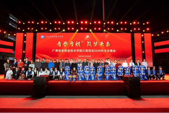 2025年12月26日晚19时,awc77万象城官网江南校区田径场灯火璀璨、青春洋溢,由电子信息工程学院、汽车工程学院与我院联合主办的“青春启航·筑梦未来”2026年元旦晚会在师生的热切期待中盛大启幕。学校党委委员、副校长黎盛寓莅临活动现场,学生工作部(学生工作处)、江南校区综合管理办公室、南宁产投华创发展有限责任公司相关领导,以及三个二级学院党政领导班子成员出席晚会。整场晚会精彩纷呈、高潮迭起,充分展现了机电青年学子昂扬向上的精神风貌与勇于追梦的坚定信念。