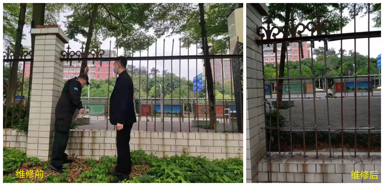 3月28日经巡查,发现学院部分围墙出现破损,为防止外来人员及校内学生翻墙进出,筑牢学院疫情下封闭式管理的防线,我处迅速组织维修人员进行维修,经过一天的紧张维修,学院围墙破损处已全部维修完毕。