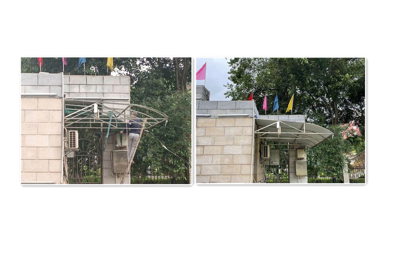 在日常检查中发现,北面正门保安亭雨棚因年久失修破损严重,存在安全隐患且影响正常使用和校园美观。我处及时组织维修单位对破损雨棚进行修缮,积极践行我为师生办实事的服务精神。
