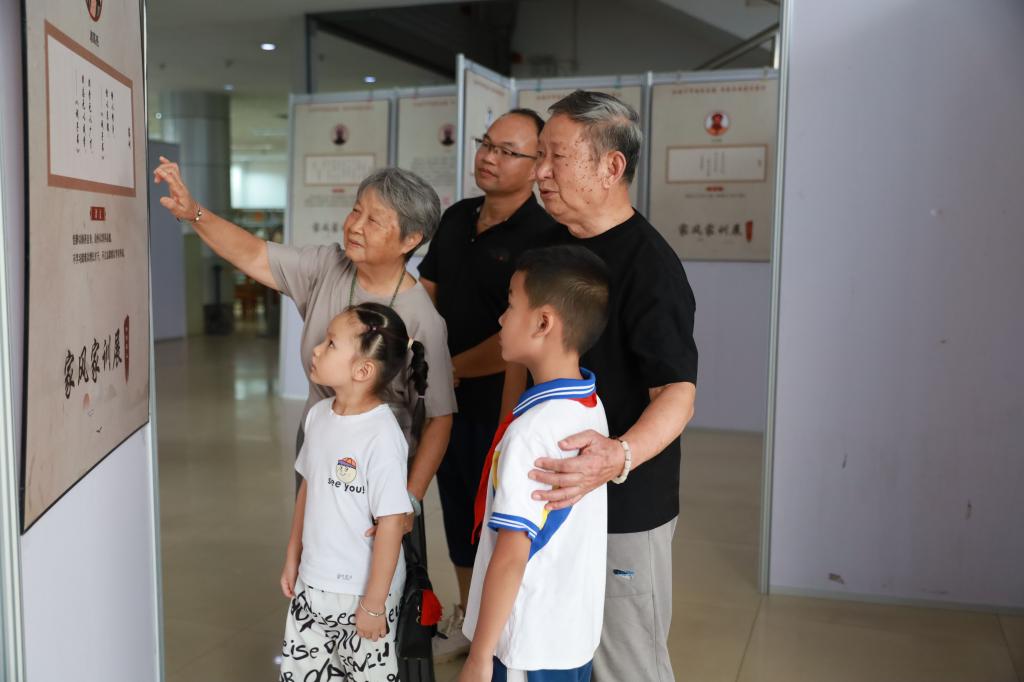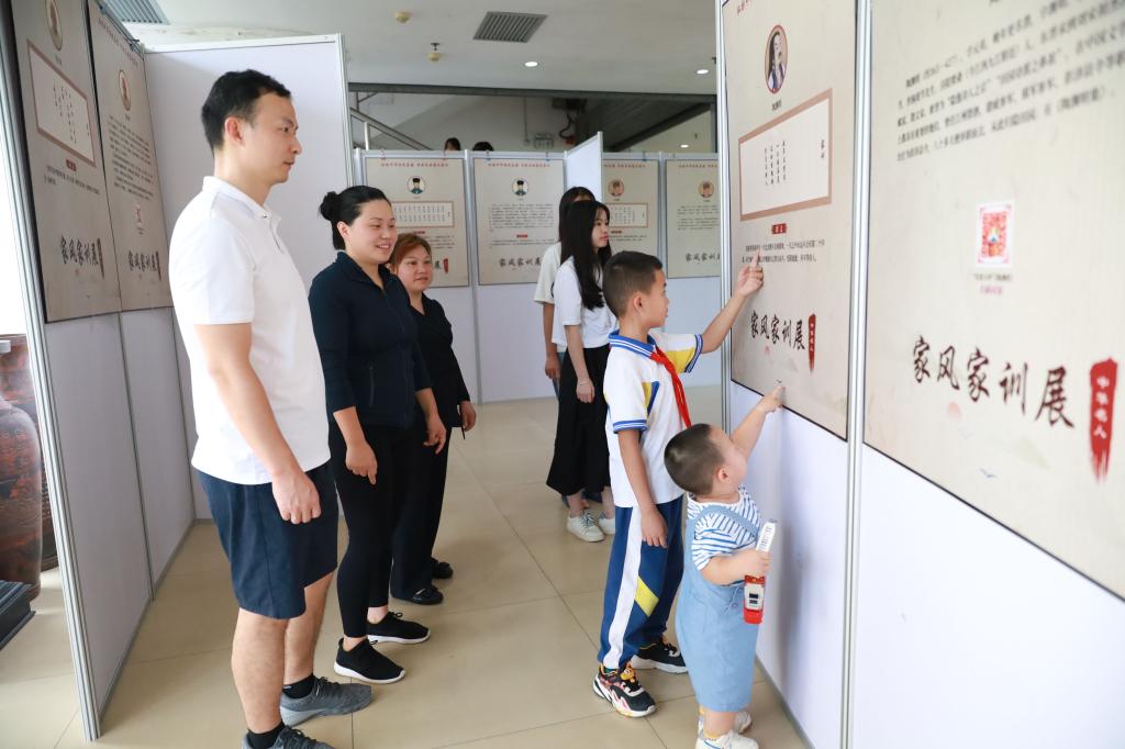 廉洁家访活动期间,教职工及家属观看中华名人家风家训展情景