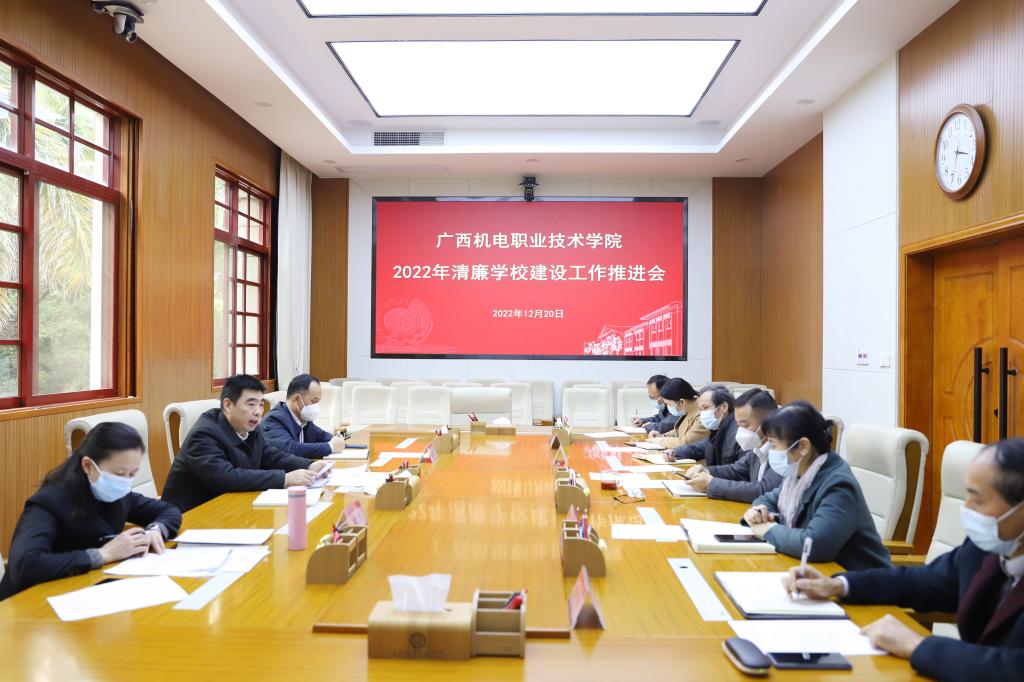 会议传达了清廉广西建设工作推进会会议精神、全区清廉学校建设工作推进视频会议精神。会议通报了学校2022年清廉学校建设工作情况,研究落实了2022年区管高校清廉学校建设考核有关事项。会议要求,要贯彻落实清廉广西建设工作现场推进会和全区清廉学校建设工作推进视频会议精神,围绕党风优良、校风清廉、教风清正、学风清新这一目标继续查漏补缺、狠抓落实。