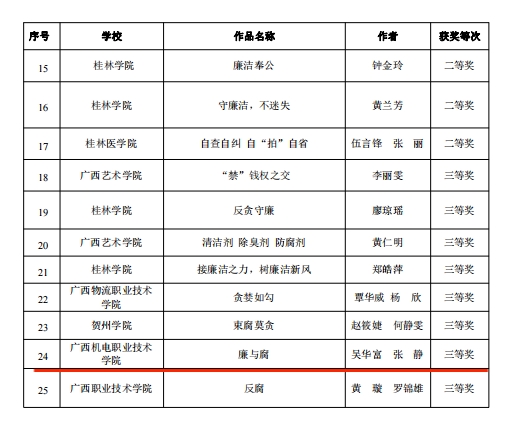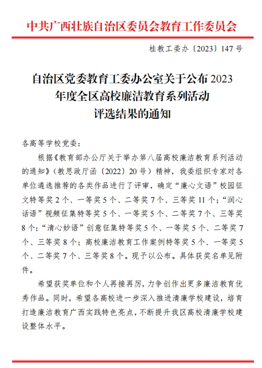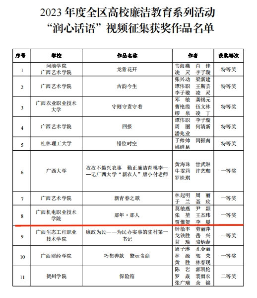 近日,自治区党委教育工委公布了2023年度全区高校廉洁教育系列活动评选结果,万象城官网2项作品入选并获奖。其中莫敏燕、尹颖、张堃、王杰玮、贾惟贺、李晨等共同拍摄的《那年·那人》获全区高校廉洁教育系列活动“润心话语”视频征集一等奖,吴华高、张静共同设计的《廉与腐》获全区高校廉洁教育系列活动“清心妙语”创意征集三等奖。
