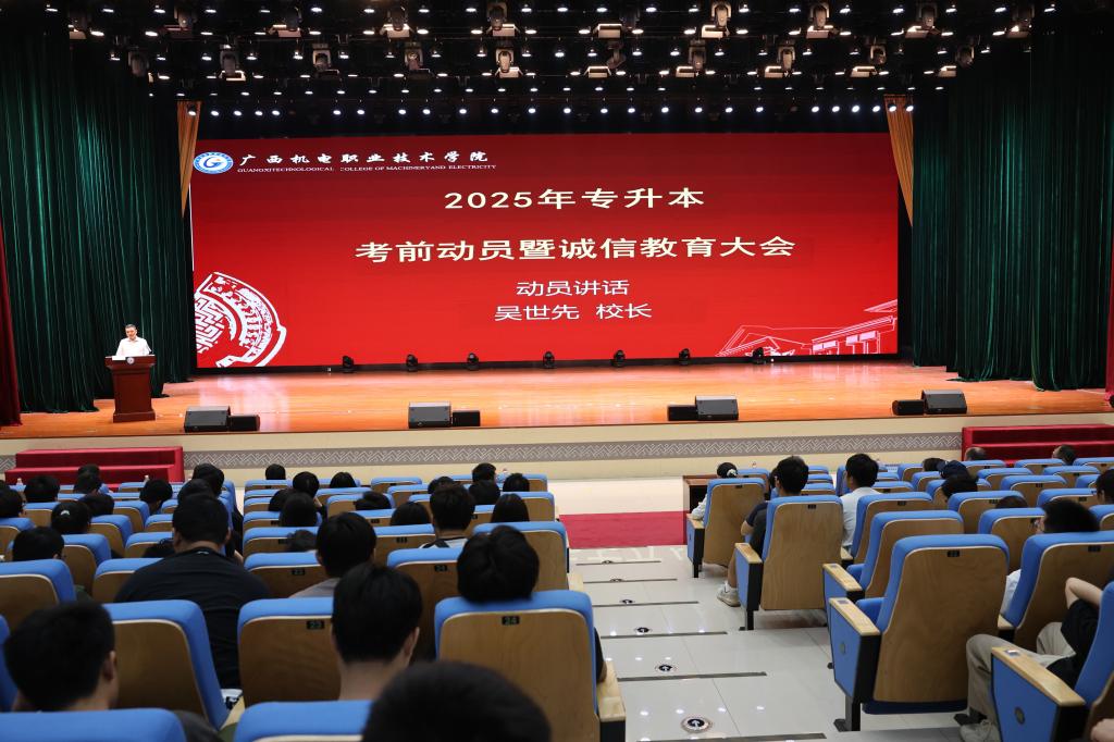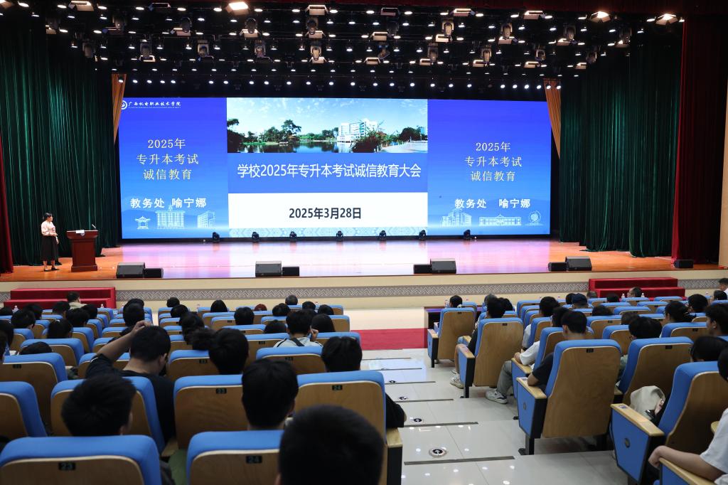 为激发专升本考生备考热情,强化诚信考试意识,学校于3月28日在弘毅楼大礼堂举行2025年专升本考前动员暨诚信教育大会。学校校长吴世先出席会议并做动员讲话,副校长黎盛寓主持会议。教务处和各二级学院负责人、2022级专兼职辅导员、专升本班主任、任课教师和全体专升本考生参加大会。