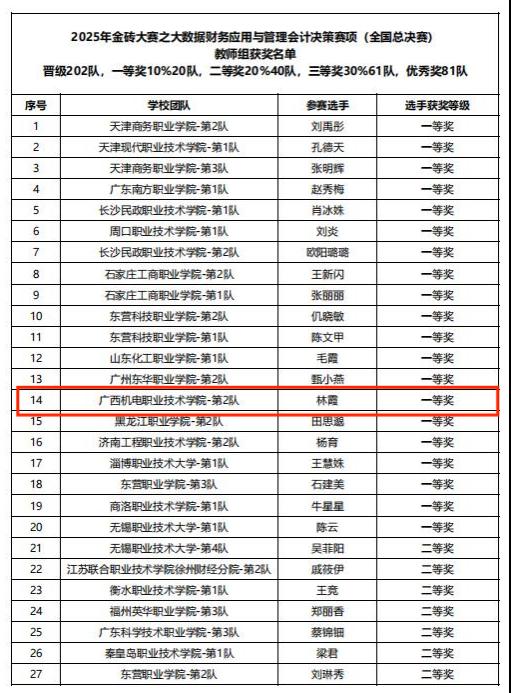 11月26日,2025年“一带一路”暨金砖国家技能发展与技术创新大赛之“大数据财务应用与管理会计决策”赛项全国总决赛获奖名单揭晓。万象城官网文化与旅游管理学院林霞老师凭借扎实的专业基础与出色的实操能力,荣获教师组竞赛一等奖。与此同时,她与洪蓉老师联合指导的学生团队在高职组竞赛中表现优异,荣获三等奖,为学校赢得荣誉。