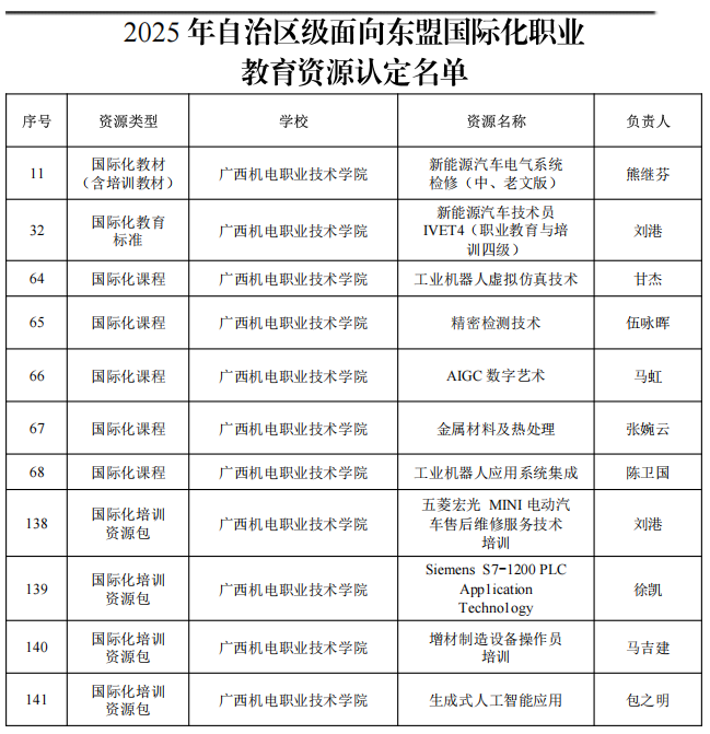 此次获认定的项目精准对接中国—东盟区域产业发展需求,创新融合先进技术、多语种教学与实践培训模式,充分彰显了学校在新能源汽车、智能制造、人工智能、材料工程等前沿领域的教学资源建设实力。